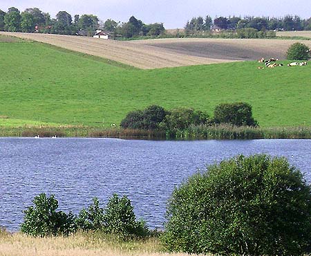 Svaner og køer på græs