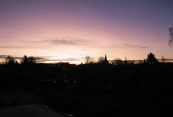 og nu 1½ time efter er solen helt oppe bag kirketårnet.