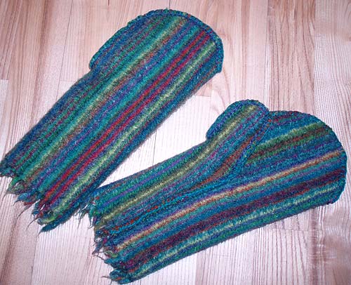 Her er mine 4 første blokke – quiltet på ca 5 minutter! De 2 af dem set fra bagsiden, der godt kan bestå af forskellige stykker stof (så får man også brugt rester til det!)