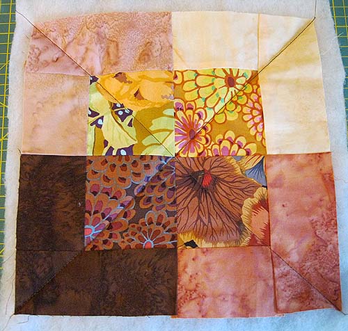 Nu skal det være! Blokkene sys helt som vanligt i det mønster, man har valgt. Derefter skæres 1 stk. bagsidestof og 1 stk mellemfoer, begge en lille smule større end blokken. Alle 3 dele sandwiches (lægges sammen) med en lille smule spraylim (det bruger jeg, men det kan undværes – HUSK kun at spraye på vattet på begge sider, ikke på stoffet!), og så quilter man den blok.