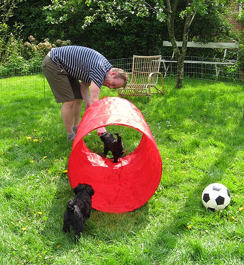 Jeg havde lavet en patchwork-bold til hver af dem, med en stor bjælde indeni, pakket ind i pladevat – gad vide, hvor længe de holder, men de er gode, for de siger noget, når man triller med dem.