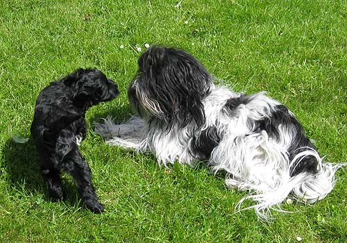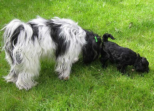 Det er ikke nogen helt nem opgave at fotografere 2 Tibetanere, der mødes for første gang under famliens bevågenhed – en stor fornuftig hund på 2 år og en lille på 8 uger! Der skal knipses mange, mange gange, og så er der et stort redigeringsarbejde efterfølgende.