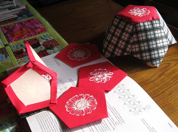 5-kanterne blev syet sammen i 2 halvdele – “skåle”, som så blev syet sammen, bortset fra de 2 sidste sømme, så jeg havde noget at vende den igennem. Der er strøget veledon på bagsiden af 5-kanterne, så den kan holde faconen.
