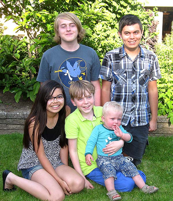 ..men HURRA! der var det, det dejligste billede af dem alle 5: Victor, 1½ år, Ebbe 11½ år, Christina 12 år, Christian 16 år, Frederik 16½ år.