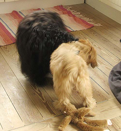 Jeg nåede lige – som jeg havde planlagt – at vaske, føntørre og børste Diki – det var til trængt! – før vi blev inviteret på besøg hos de 2 “kusiner” Bodil og BeBe. Nu kender de hinanden og leger godt sammen, ikke mindst den lille BeBe og Diki.