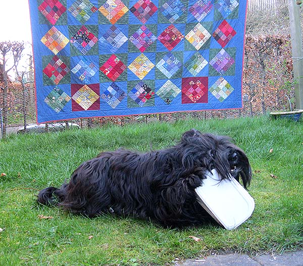 Diki er vist Danmarks mest forkælede hund…. tænk at have eget håndsyet patchwork-tæppe at ligge på…….