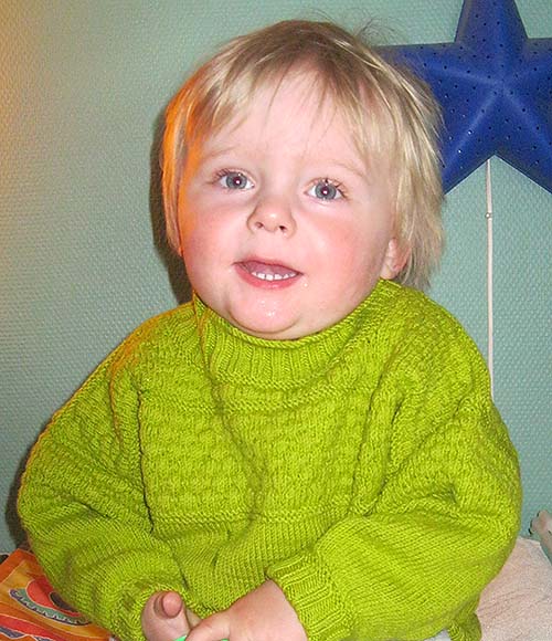 Jeg strikkede for flere år siden (før han blev født!) en limegrøn sømandsweater til Victor, som var alt for stor, den blev afprøvet i dag, og nu passer den perfekt.