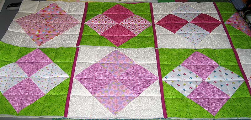 blev blokkene færdige, quiltede, renskårne og med strimler til samling klar, så det kan ses, hvordan, man gør.