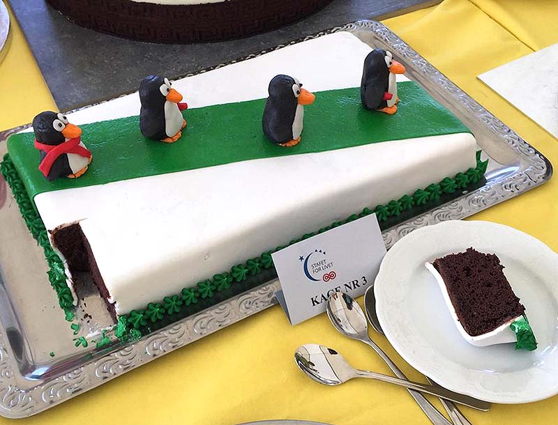 7 “kendte” personer fra Fredericia havde sagt ja til at deltage i dysten, og derudover kunne byens borgere også tilmelde sig. I alt 20 kager deltog. Svigersønnen, der er journalist i byen, var en af de 7, der havde sagt ja – og de måtte gerne få hjælp, så hans kone, der er en rigtig god bager – mest af brød, boller og småkager – lagde sig rigtig i selen med at eksperimentere og udtænke en rigtig lækker kage.
