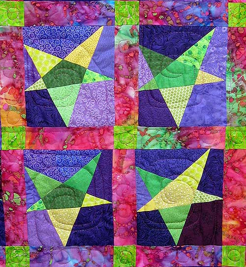 Blokkene syet i hånden, syet sammen på maskine, quiltet på long-arm-maskinen, lukkekant syet på maskine og sømmet i hånden. Jeg kan godt lide at sy lukkekant, det er afslutningen, og det kan man sidde med lige så stille, ude eller hjemme, foran TV eller mens man snakker, bare det er “pakket” rigtigt (foldet sammen og rullet lidt) så det ikke fylder for meget