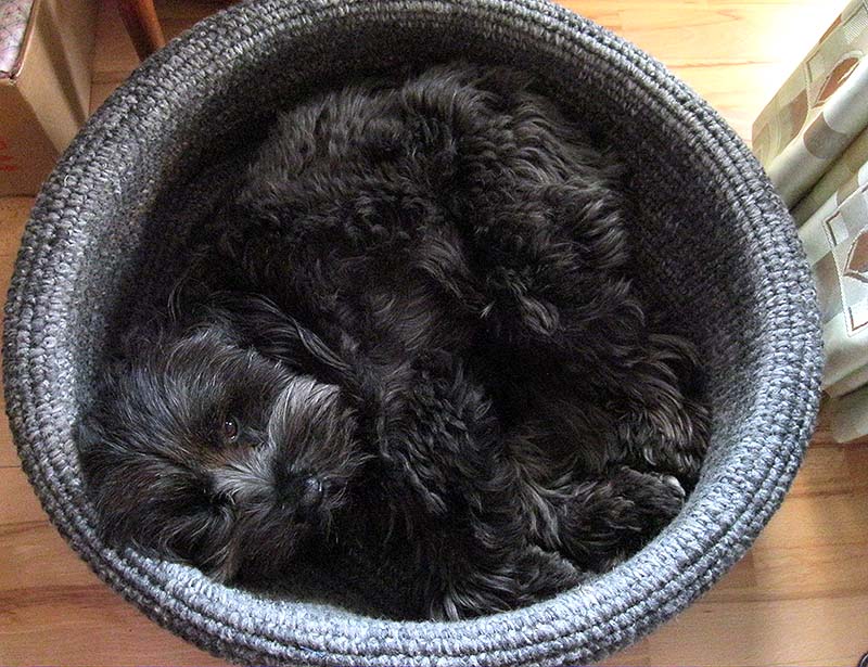 Men nu har han både drukket vand og spist lidt tørkost, og vi har både været ude at gå tur, og har haft besøg af nabohunden Bølle, som lige skulle høre, hvad der var sket! Og nu hygger han i sin fine hæklede kurv!