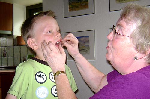 Ebbe og hans mor er kommet for at hjælpe med forberedelser, og Mormor skulle hjælpe med en rokketand, som Ebbe har haft meget længe! Det har jeg jo prøvet mange gange før, så en stærk quiltetråd om fortanden – og så skulle vi jo bare have lov at trække!