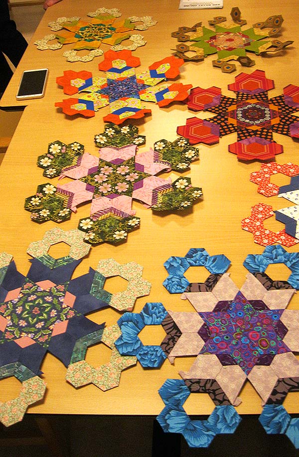 Vi syr en “Mystery” – dvs et tæppe, som vi ikke kender mønsteret på! Vi får mønstre til en eller et par blokke, alle syet som “English Paper Piecing”, også kendt i DK som “syning over pap”! Og alle er rosetter, bestående af hexagoner/sekskanter, romber eller trekanter o.lign. Vel at mærke i egne stoffer, så alt bliver individuelt.