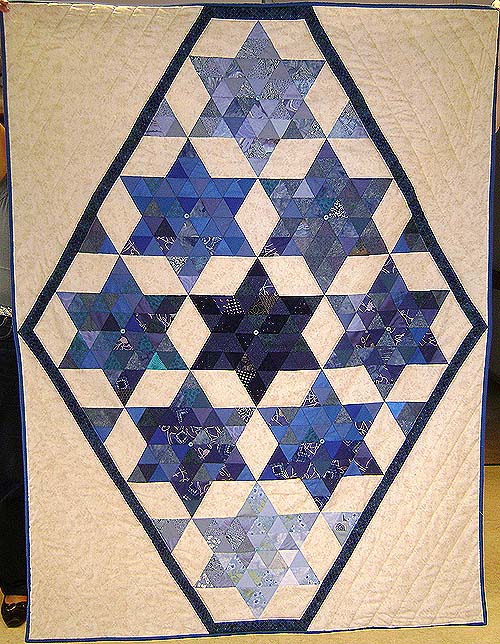 Bente har tidligere syet ét smukt tæppe af nogle af trekanterne, og nu har hun syet ét mere – det er næsten ufatteligt smukt i alle de blå nuancer! Der er mange forskellige blå farver og mønstre, og der er også silker imellem. Bettina har haft det hele liggende i 10 år, fordi hun ikke syr traditionel patchwork mere, men mest billeder og tasker. Og så er det jo skønt, at hun lader det hele komme til ære og værdighed, og at Bente er så flittig til at sy!