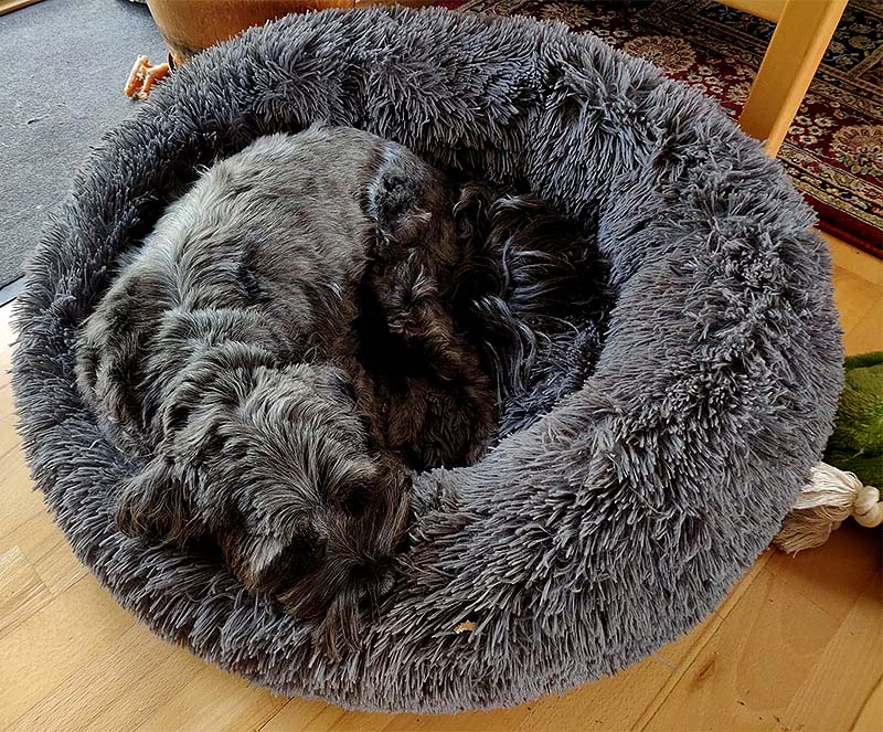 Han har 4 kurve at skifte imellem, og han er glad for dem alle. Den ene, syet af bævernylon med løs hynde, er seng og står i sovekammeret, den vaskede jeg i går, fordi jeg syntes, den lugtede. Og hold da op, hvor blev han glad, da den var tør i går aftes, og han fik den i brug, det var virkelig sjovt!