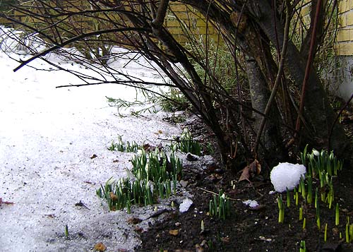 Ja – de er der! Vintergækkerne!! Lige så snart sneen smelter, så er de indenunder! Jeg tænkte det nok, og ganske rigtigt – hvad så vi i morges ude på terrassen, hvor der har ligget et tykt lag sne nu i over 2 måneder?