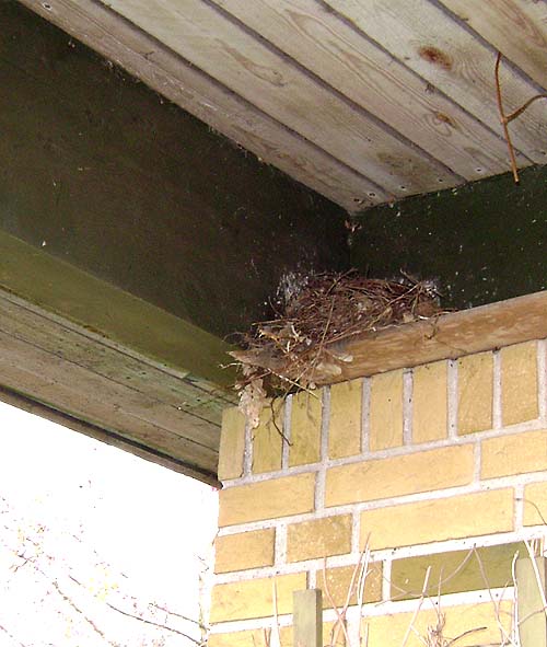 – og ovenover køkkenvinduet er der ved at blive bygget en rede mere på den hylde, Søren satte op for en del år siden til det samme. Han ville nemlig ikke have dem i carporten. Men jeg nænner jo ikke at rive den ned. Jeg krydser bare fingre for, at der ikke er en kat, der opdager den!